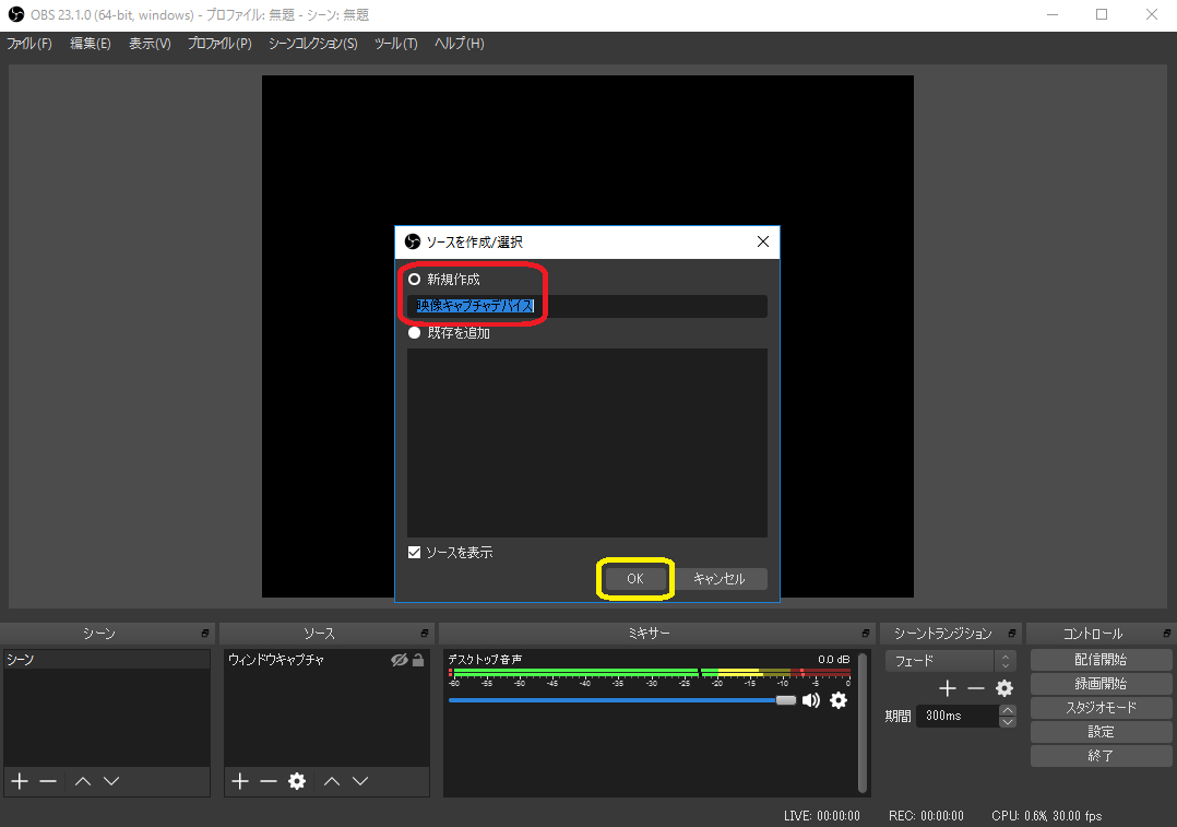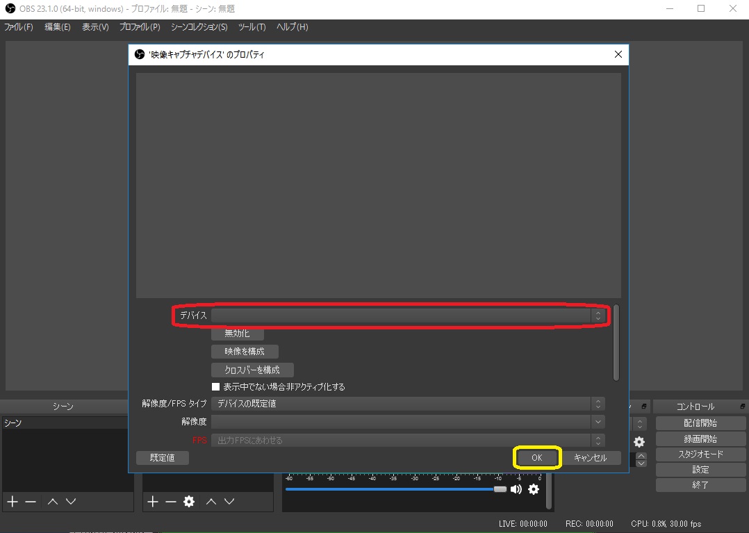 デバイス でWebカメラを選択します OK をクリックします ※OBS Studioで画面が映らないときの対処法 ■マイク マイクをPCに繋ぎます ※OBS Studioは USB接続でも 3.5mmステレオミニプラグ接続でも オーディオインターフェースに接続したマイクでもOKです