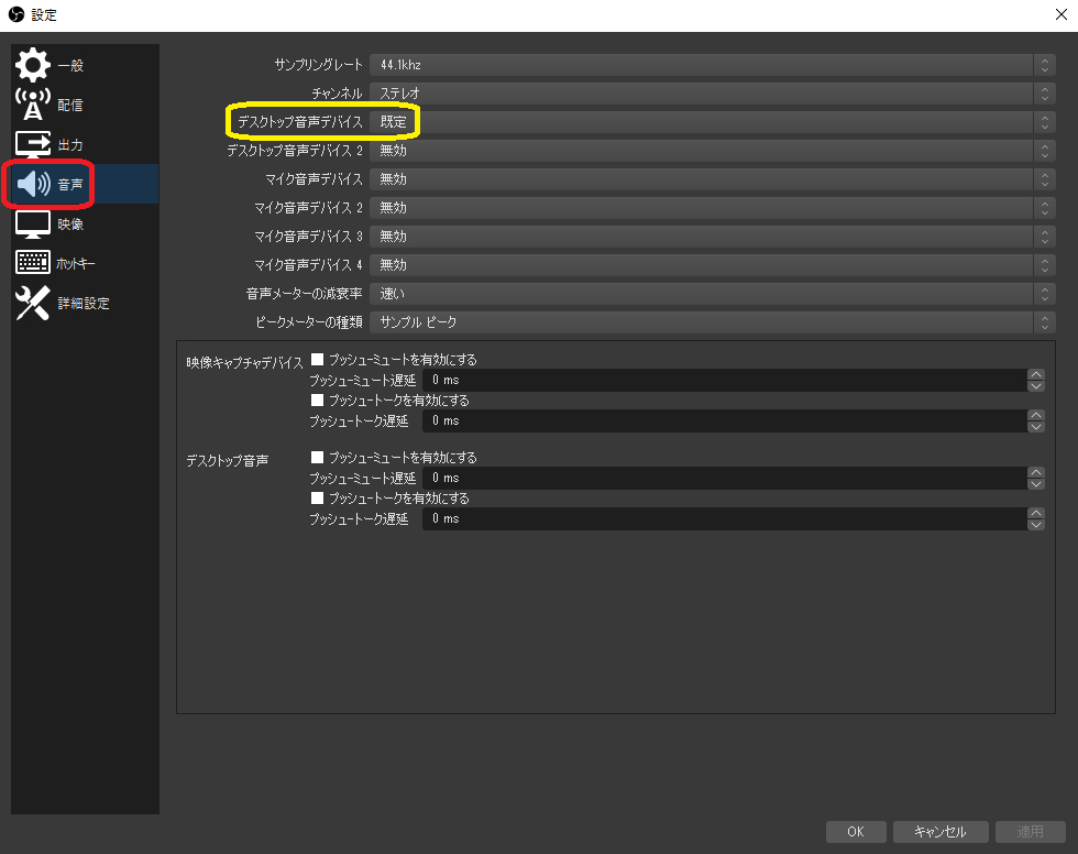 音声 をクリックし デスクトップ音声デバイス を 既定 にします これはPCから現在出ている音を配信するための設定です