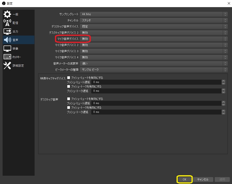 使用するマイクを マイク音声デバイス で指定し OK をクリックします これは自分の声を配信に乗せるための設定です ※複数のマイクを使う時は マイク音声デバイス 2 や マイク音声デバイス 3 を使用します ※OBS Studioでゲーム音・PCの音が出ないときの対処法