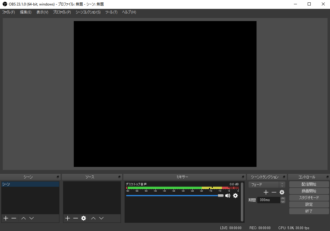 インストール完了です Finish をクリックします ※Launch OBS Studio 23.1 に チェックを付けておくと Finish をクリックした後に OBS Studio が起動します チェックを外すと Finish をクリックした後に OBS Studio が起動しません
