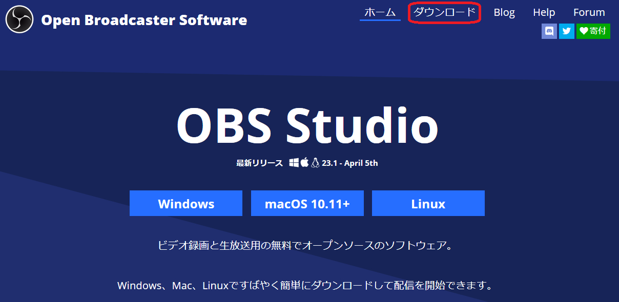 OBS Studio (https://obsproject.com/ja) に行き Windows macOS 10.11+ Linux があるので 自分の環境に合った物をクリックします