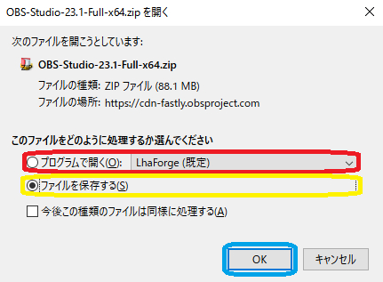 ※ 上の画像のような小窓が開いた場合は プログラムで開く(zipファイルを自分のPCに残したくない時に)※ ファイルを保存する(zipファイルを自分のPCに残したい時に) 上記を指定して OK をクリックします ※ LhaForge は当方が使用している 圧縮解凍ソフト です 使用している 解凍ソフト の名前が出ます
