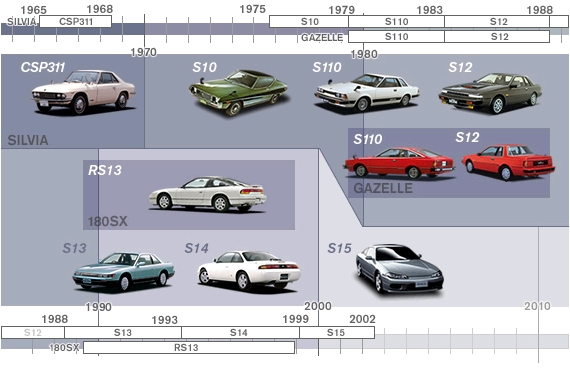 日本では1989年にガゼールの後継車種として販売が開始されたが すでに米国では2400ccのKA24E型SOHCエンジンを搭載し 240SX(トゥー・フォーティー・エスエックス) として販売されていた また欧州では 日本仕様と同じ1800ccのCA18DET型DOHCターボエンジン(175ps)を搭載し 200SX(欧州各国で読みは異なる) として販売した 初期型の特徴としては 日産の翼形グリルをイメージしたダミーのグリルがフロントバンパーにあること 前席シートがヘッドレスト一体型なことである グレードは TYPE I とTYPE II で TYPE I はスピーカーや電動ドアガラスが付かないなど競技用のベース車用途を対象にしていた 尚 米国版の240SXにはノッチバック・クーペ仕様が存在する これは車体後部がシルビアと同じで 後に作られた シルビア に 180SX の前部外装を取り付けた改造車のワンビアと同じ形状となる 尚 これの逆をシルエイティと呼ぶ
